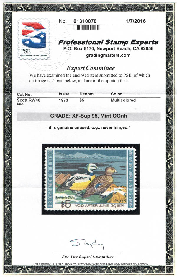 Lote 547![]() ![]() Hunting Permit, 1973, $5 Steller's Eiders (Scott RW40), an almost perfectly centered gem, o.g., never hinged, Extremely Fine to Superb, with 2016 P.S.E. certificate graded XF-SUP 95. SMQ $80. Estimate $60 - 80. |