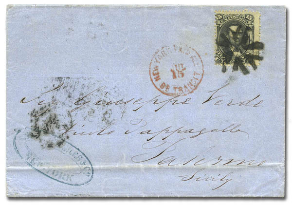 Lote 55![]() 1867, 15¢ Lincoln, black, E. grill (Scott 91), centered to left, paying the 15¢ Closed Mail rate on an 1868 folded letter from New York to Palermo, Italy, with French and Italian backstamps, Fine to Very Fine. Scott $700. Estimate $200 - 300. |