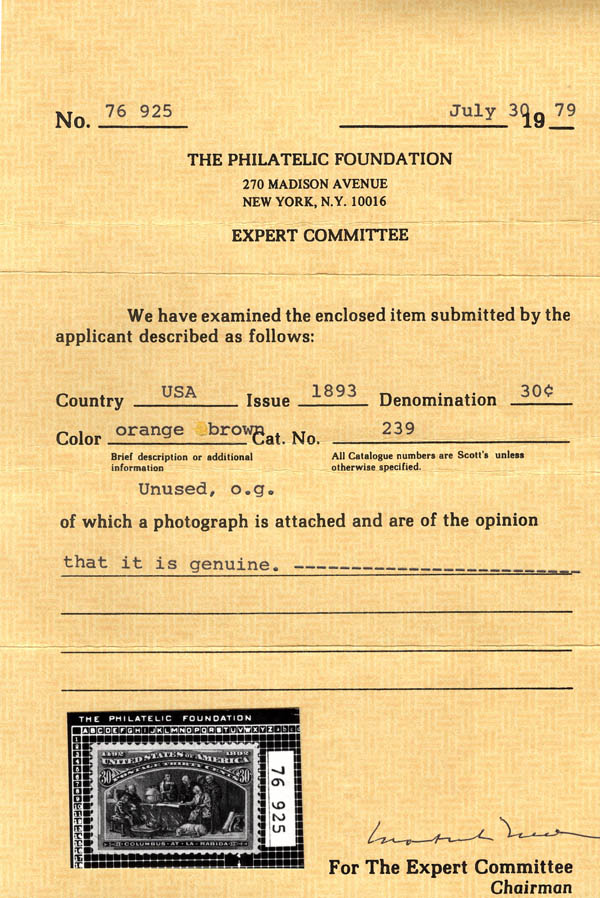 1893, 30¢ Columbian (Scott 239), o.g., hinged, nearly Very Fine, with 1979 P.F. certificate. Scott $225.