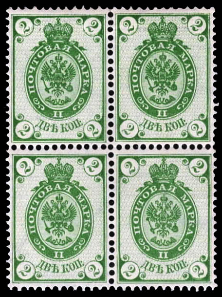 Lote 56![]() ![]() ![]() Russia, 1888, Coat of Arms, 2k yellow green (Scott 32a), a beautifully well centered block of 4, lovely fresh color, o.g., never hinged, Very Fine. Scott $130 as hinged. Michel 40. Estimate $100 - 150. |