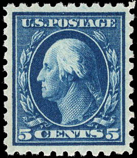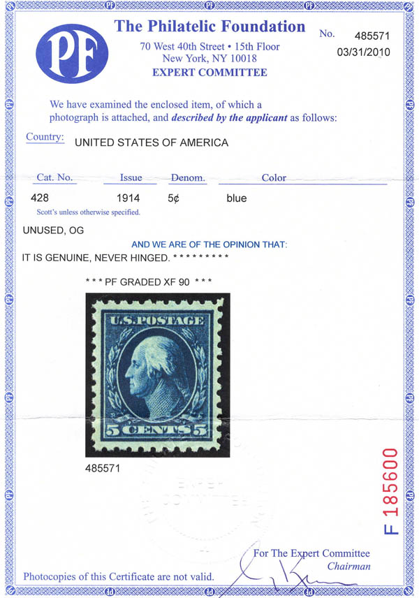1914, 5¢ Washington, blue, S.L. watermark, perf. 10 (Scott 428), o.g., never hinged, Extremely Fine, with 2010 P.F. certificate graded XF 90. Scott $75. SMQ $120.