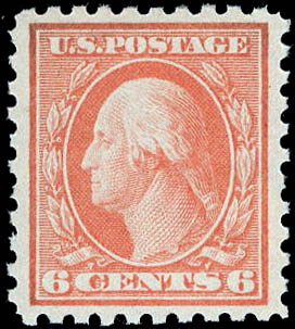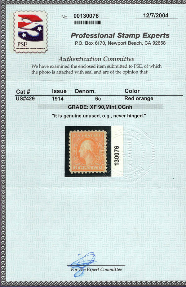 1914, 6¢ Washington, red orange, S.L. watermark, perf. 10 (Scott 429), o.g., never hinged, Extremely Fine, with 2004 P.S.E. certificate graded XF 90. Scott $105. SMQ $250.