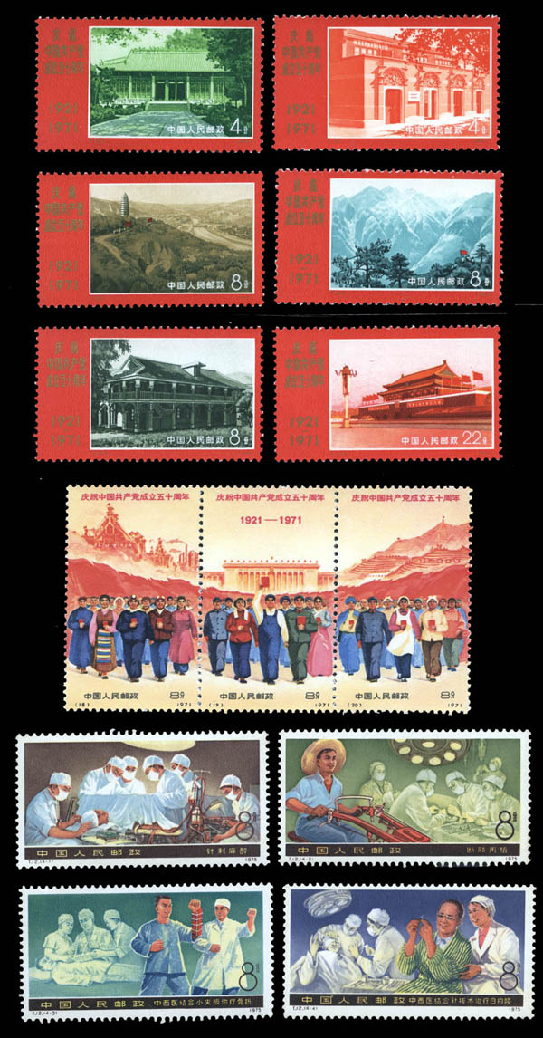 Lote 59![]() ![]() China (People's Republic), 1971, Chinese Communist Party 50th Anniversary (N4) complete, and 1976, Medical Achievements (T12) complete, including the 8f N4 strip of 3 (folded), o.g., never hinged, Very Fine. Scott 1067-1075, 1271-1274; $389. Estimate $150 - 200. |