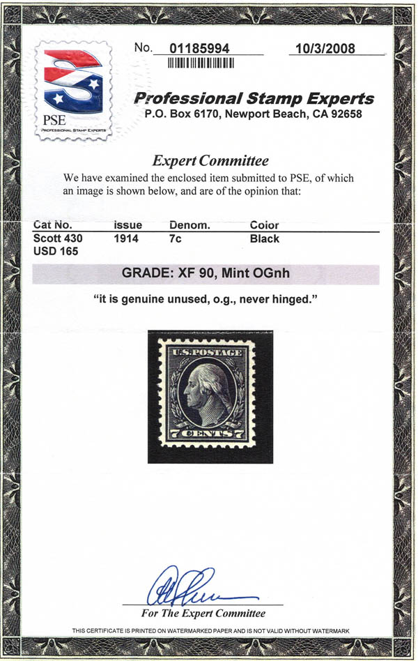 Lote 59![]() ![]() 1914, 7¢ Washington, black, S.L. watermark, perf. 10 (Scott 430), exceptionally well centered, o.g., never hinged, Extremely Fine, with 2008 P.S.E. certificate graded XF 90. Scott $190. SMQ $450. Estimate $300 - 400. |