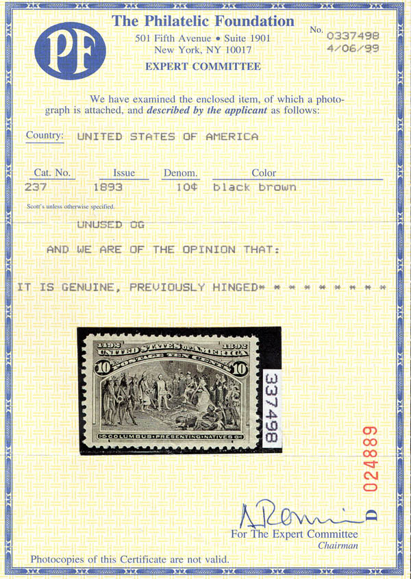 1893, 10¢ Columbian (Scott 237), gorgeous centering amid large margins, o.g., very lightly hinged, Extremely Fine or better, with 1999 P.F. certificate. Scott $95.