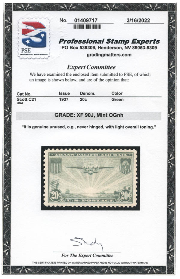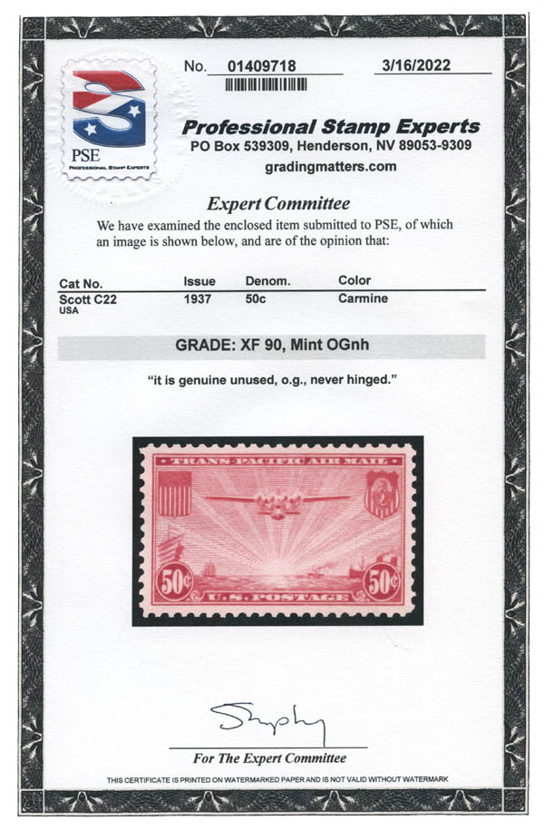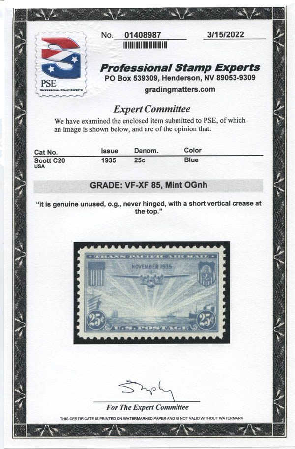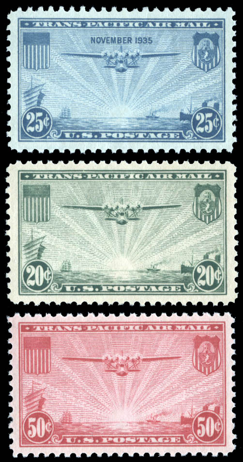 Lote 591![]() ![]() Airmail, 1935-37, China Clipper complete (Scott C20-C22), a beautifully well centered group, o.g., never hinged, Very Fine to Extremely Fine, each with 2022 P.S.E. certificate graded VF-XF 85. SMQ $100. Estimate $75 - 100. |