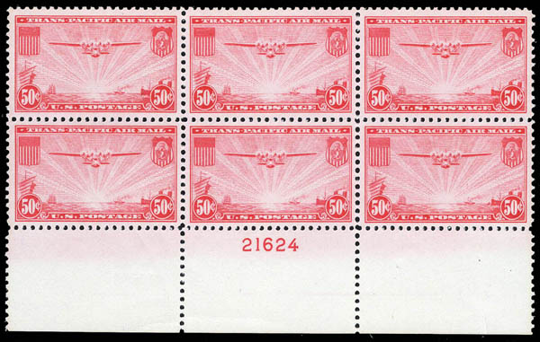 Airmail, 1937, 50¢ China Clipper (Scott C22), plate block of 6, perfect in every respect, o.g., barest trace of hinge (appears never hinged), Extremely Fine. Scott $85.