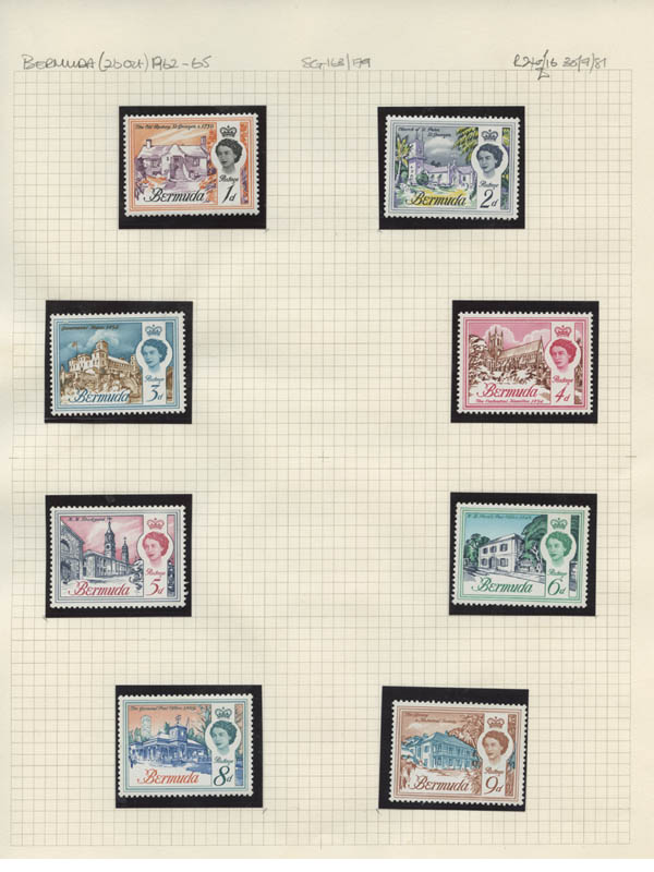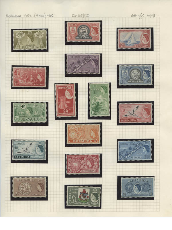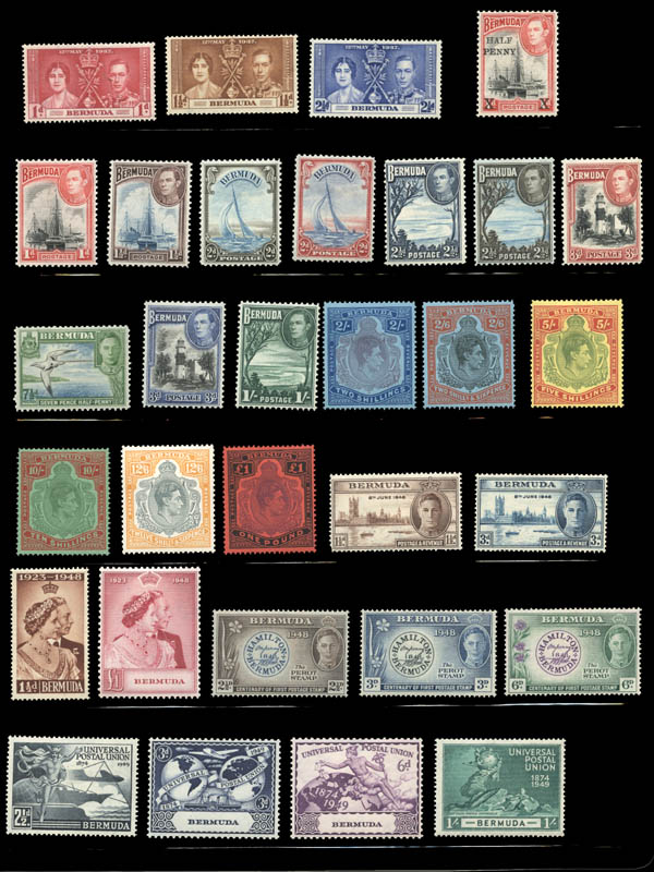Lote 6![]() /![]() Bermuda, 1937-62, King George VI issues complete + 1st two Queen Elizabeth II definitive sets (Scott 115-141, 143-162, 175-191), o.g., 2nd QEII set never hinged, others hinged or hinge remnant, Fine to Very Fine. Scott $472. SG 107/133, 135/150, 163/79; £574 ($710). Estimate $120 - 150. |