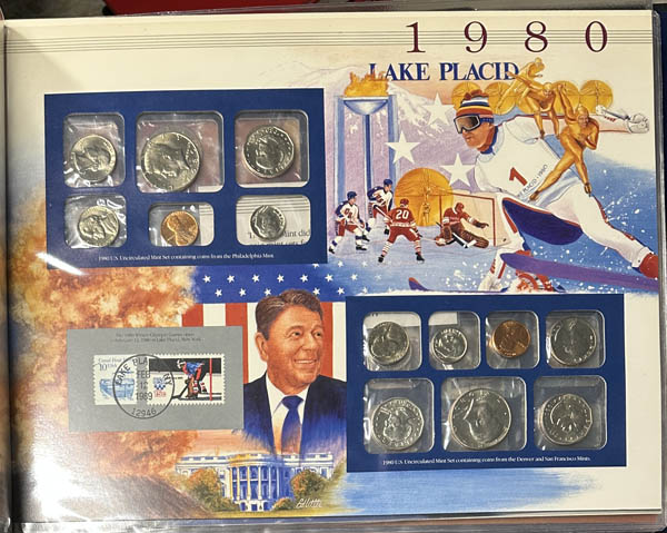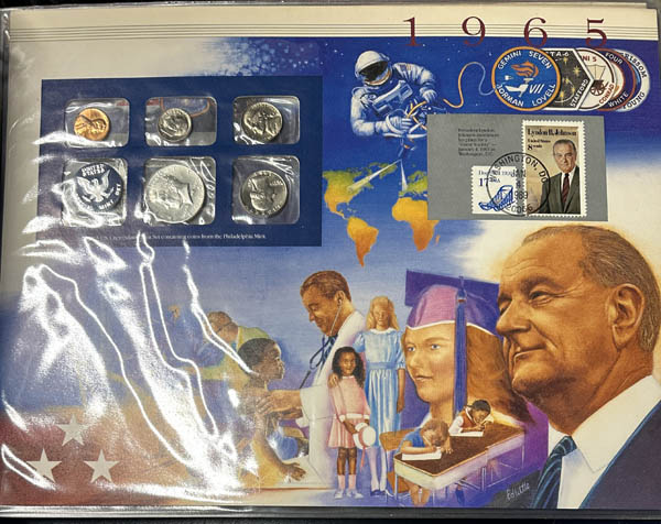 Lote 60 1965-1998 Uncirculated Coin Mint Sets, by the Postal Commemorative Society featuring a total of $60.82 in face value along with neat cancellations of various stamps on presentation cards. Estimate $60 - 80. |