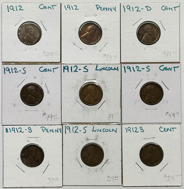 1912, 1912-S, 1912-D 1¢ Lincoln group of 9, beautiful mostly brown coins. Dealer's marked retail comes to $507.