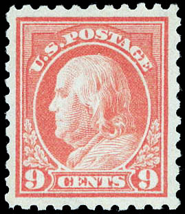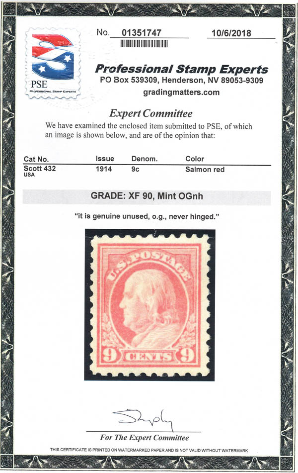 1914, 9¢ Franklin, salmon red, S.L. watermark, perf. 10 (Scott 432), o.g., never hinged, Extremely Fine, with 2018 P.S.E. certificate graded XF 90. Scott $80. SMQ $250.