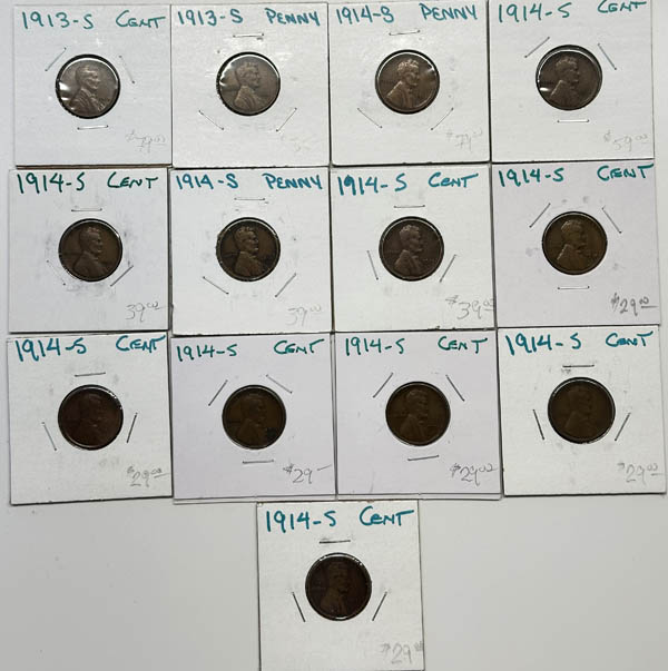 1913-S, 1914-S 1¢ Lincoln group of 13, beautiful mostly brown coins. Dealer's marked retail comes to $543.