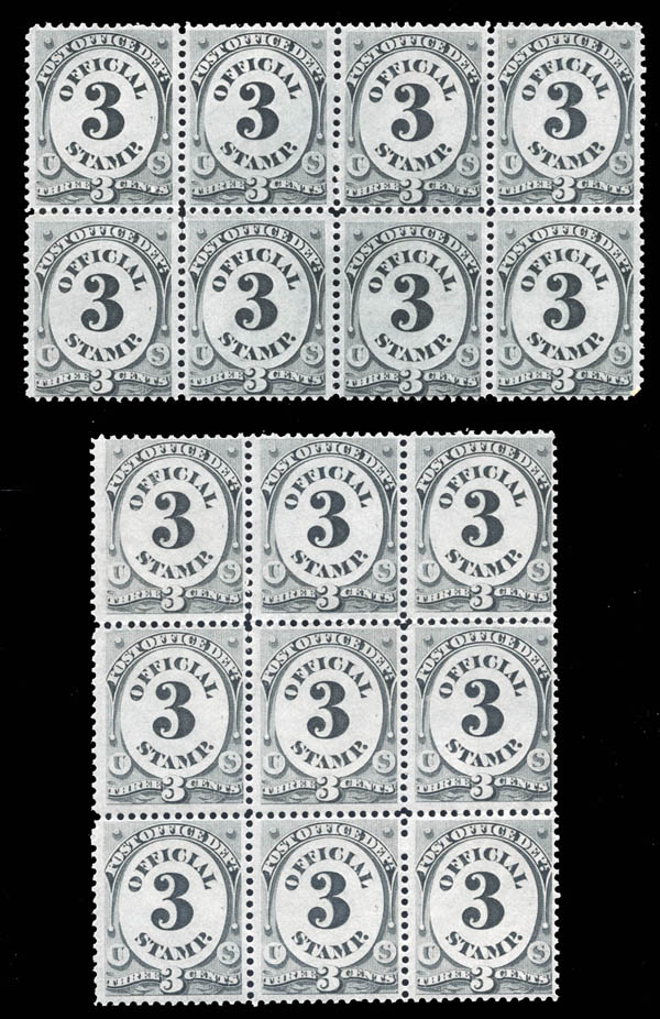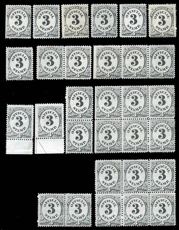 Post Office Dept., 1873, 3¢ black (Scott O49), wholesale group of 48, in singles, pairs and blocks, o.g., never hinged. Scott $1,200.