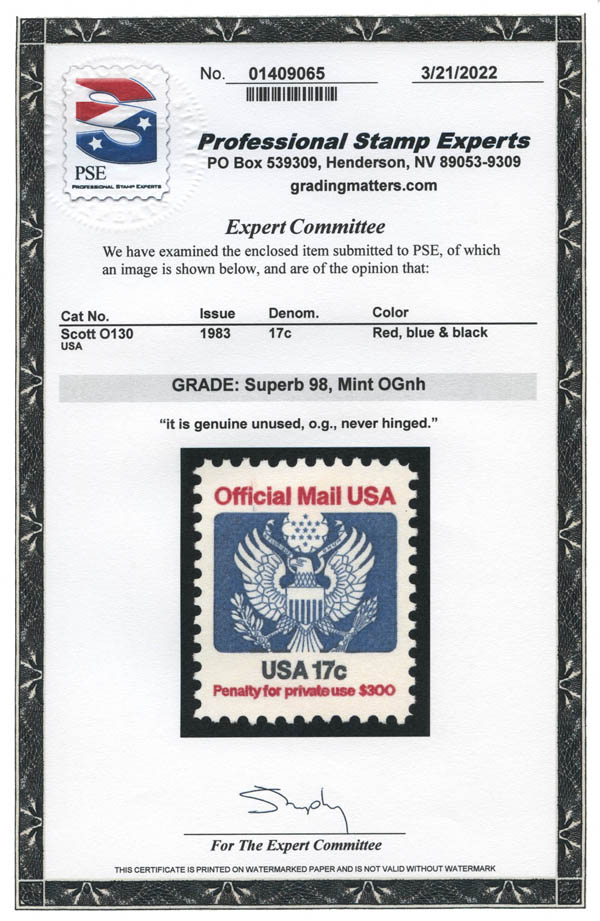 Official Mail, 1983, 17¢ red, blue & black (Scott O130), perfectly centered, o.g., never hinged, Superb, with 2022 P.S.E. certificate graded SUP 98.
