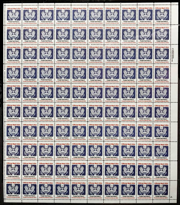 Official Mail, 1985 (14¢) red, blue & black (Scott O138), complete sheet of 100, well centered throughout, o.g., never hinged, Very Fine. Scott $508.