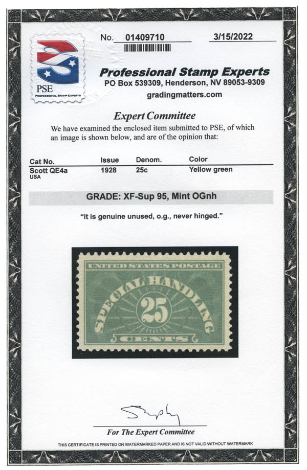 Lote 709![]() ![]() Special Handling, 1928, 25¢ yellow green (Scott QE4a), unusually well centered, o.g., never hinged, Extremely Fine to Superb, with 2022 P.S.E. certificate graded XF-SUP 95. SMQ $160. Estimate $120 - 150. |