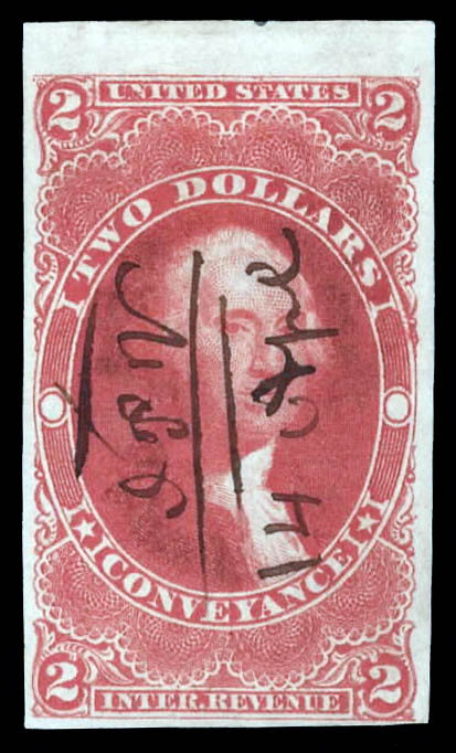 Lote 716 o Revenue, 1862, First Issue, $2 Conveyance, imperf (Scott R81a), top margin single, clear to huge margins all around including sheet margin at top, intense color, manuscript cancel 14 Apr, Very Fine, with 2022 P.F. certificate. Scott $250. Estimate $150 - 200. |