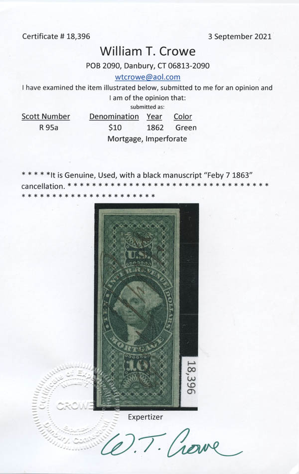 Lote 720 o Revenue, 1862, First Issue, $10 Mortgage, imperf (Scott R95a), margins all around (large on 3 sides), deep rich color, neat July 7, 1863 manuscript cancel, Fine to Very Fine, with 2021 Crowe certificate. Scott $900. Estimate $250 - 350. |
