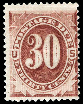 Postage Due, 1879, 30¢ brown (Scott J6), handstamped "BROWN" on reverse, o.g., hinge remnant, Fine. Scott $400.