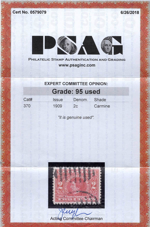 1909, 2¢ Alaska-Yukon (Scott 370), outstandingly choice, Extremely Fine to Superb, with 2018 P.S.A.G. certificate graded XF-SUP 95. SMQ $85. Scott Stamp Values $80.