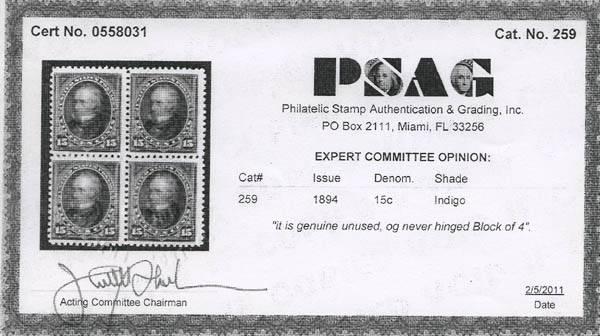 1894, 15¢ Clay, dark blue, unwatermarked (Scott 259), o.g., never hinged, Fine, with photocopy of 2011 P.S.A.G. certificate for block. Scott $850.