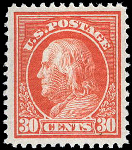1914, 30¢ Franklin, orange red, S.L. watermark, perf. 12 (Scott 420), o.g., lightly hinged, Very Fine to Extremely Fine. Scott $115.