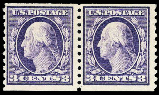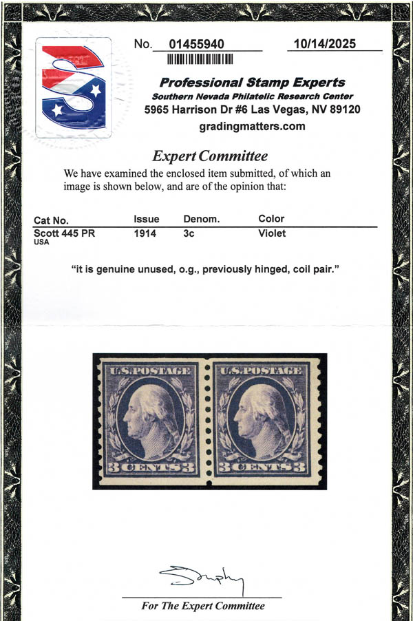 Lote 812![]() 1914, 3¢ Washington, type I, violet, S.L. watermark, flat plate coil, perf. 10 vertically (Scott 445), pair, o.g., lightly hinged, Fine, with 2025 P.S.E. certificate. Scott $500. Estimate $150 - 200. |