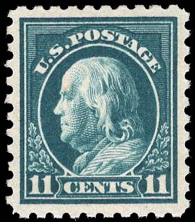 Lote 826![]() ![]() 1916, 11¢ Franklin, dark green, unwatermarked, perf. 10 (Scott 473), outstandingly well centered, with intense shade and impression, o.g., never hinged, Extremely Fine, ex-Zlowe, with 1989 P.F. and 2025 P.S.A.G. certificates, the latter graded XF 90. Scott $110. SMQ $225. Scott Stamp Values $210. Estimate $150 - 200. |