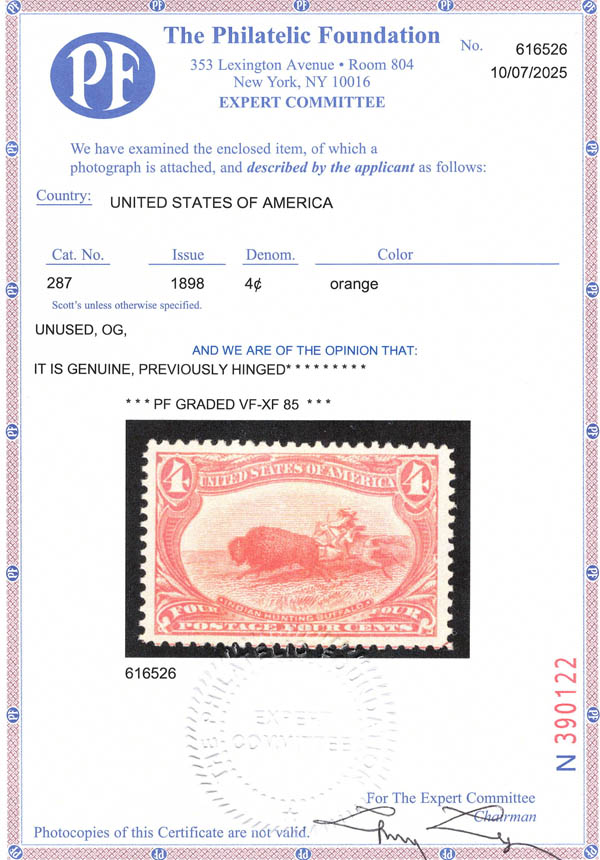 Lote 83![]() 1898, 4¢ Trans-Miss. (Scott 287), with massive margins and radiant color, o.g., lightly hinged, Very Fine to Extremely Fine, with 2001 and 2025 P.F. certificates, the latter graded VF-XF 85. Scott $110. Scott Stamp Values $150. SMQ $150. Estimate $100 - 150. |