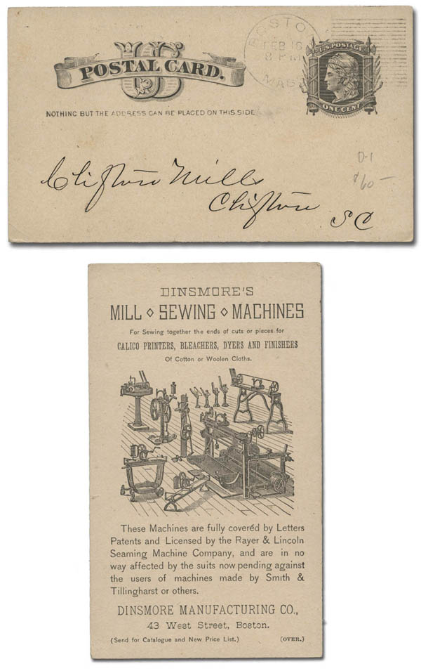 Lote 841![]() Postal Card, 1881, 1¢ Liberty, black on buff (Scott UX7), group of 6, each with ads on the reverse, including sewing machines, seeds, carriages and agricultural tools. Most are with duplex cancels but one is with an early Chicago machine cancel. An attractive lot for the collector or dealer, generally Fine to Very Fine. Marked retail prices come to $350. Estimate $100 - 150. |