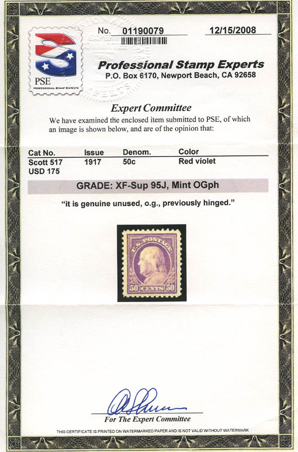 Lote 844![]() 1917, 50¢ Franklin, red violet, perf. 11 (Scott 517), a beautifully well centered jumbo, o.g., barest trace of hinge, Extremely Fine to Superb, with 2008 P.S.E. certificate graded XF-SUP 95J. Scott $48. SMQ $200. Estimate $150 - 200. |