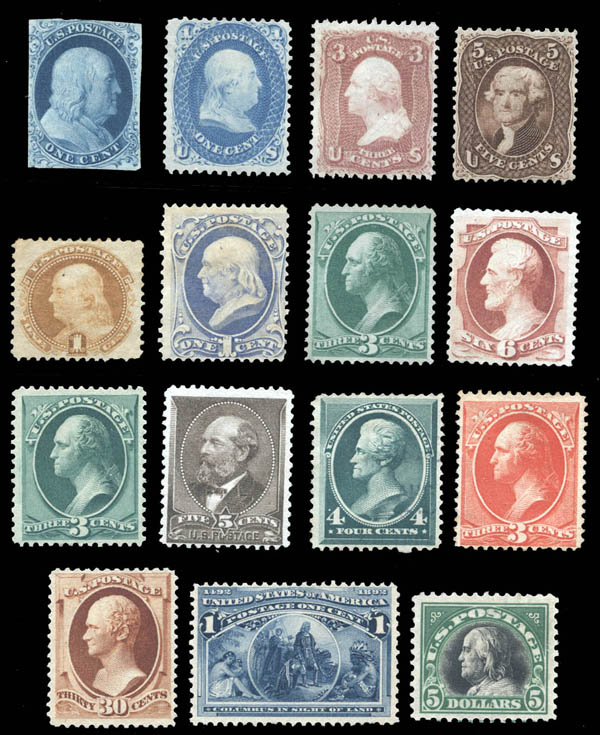 Lote 850 ( )1851-1918, small group of mint classics, all without gum, including Nos. 7 (1¢ type II, c.v. $375), 63 (1¢, c.v. $100), 65 (3¢, c.v. $50), 76 (5¢, c.v. $550), 112 (1¢ Pictorial, c.v. $210), 1870 Banknotes 145 (1¢, c.v. $240), 147 (3¢, c.v. $80), 148 (6¢, c.v. $290), 1879-88 Banknotes 184 (3¢, c.v. $35), 205 (5¢ brown, c.v. $90), 211 (4¢ blue green, c.v. $80), 214 (3¢ vermilion, c.v. $25), 217 (30¢, c.v. $90), 231 (1¢ Columbian, c.v. $14 with o.g.) and 1918 #524 ($5, c.v. $160 with o.g.). A nice clean lot with fresh colors and generally F.-V.F. centering, but all unused without gum, a useful lot for the collector who wants sound attractive stamps but who do not wishes to pay the o.g. premium, #217 with 2001 P.F. certificate. Scott $2,389. Estimate $400 - 600. |