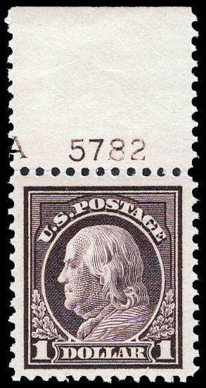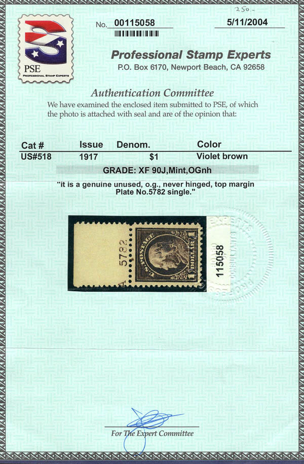 1917, $1 Franklin, violet brown, perf. 11 (Scott 518), plate number single, o.g., never hinged, Extremely Fine, with 2004 P.S.E. certificate graded XF 90J. Scott $95. SMQ $275.
