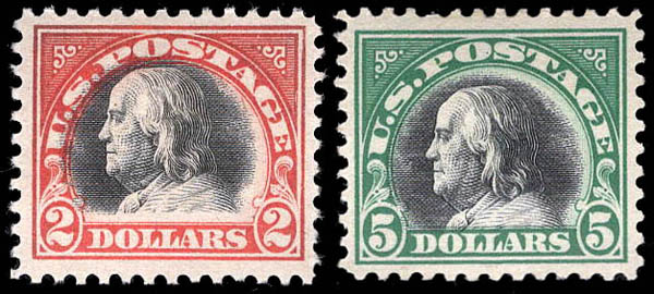 1918, $2 Franklin, orange red & black and $5 Franklin, deep green & black (Scott 523-524), o.g., hinge remnants, Very Fine. Scott $670.