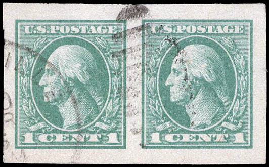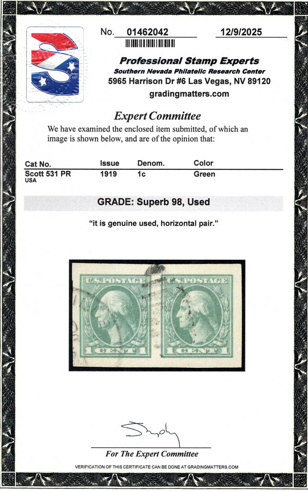 Lote 865 o 1919, 1¢ Washington, green, offset printing, imperf. (Scott 531), a magnificent gem pair, with jumbo margins and a neat light duplex cancel, Superb, with 2025 P.S.E. certificate graded SUP 98. SMQ $180. Estimate $120 - 180. |