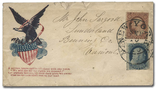 Eagle and Shield, multicolor design on a carrier cover from New York to Vermont. A few minor cover tears at top, Fine to Very Fine overall. Scott 26, 24. Weiss E-L 132. Walcott 2506.