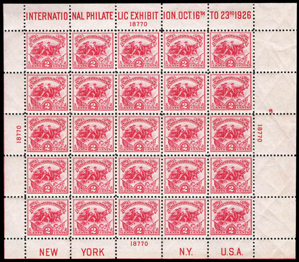 1926, White Plains souvenir sheet of 25 (Scott 630), o.g., very lightly hinged on bottom two left stamps with minor perf separations in same spot, Very Fine. Scott $260.