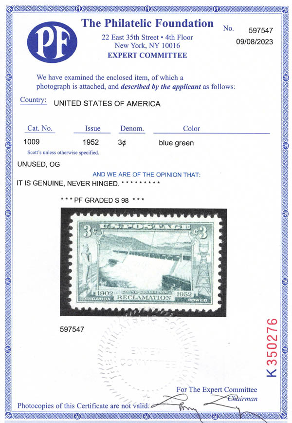 1952, 3¢ Grand Coulee Dam (Scott 1009), superbe. SMQ $110.