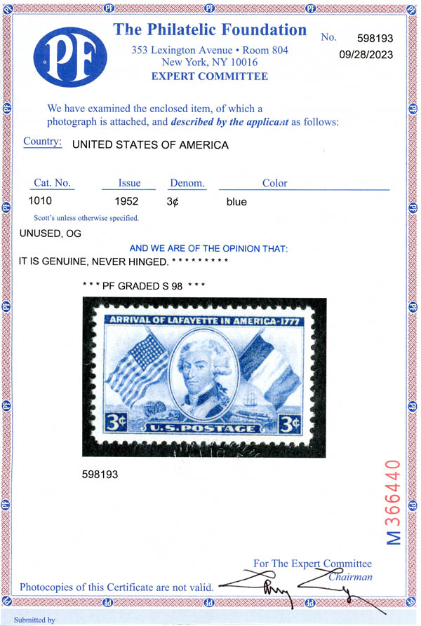 1952, 3¢ Lafayette (Scott 1010), superbe. SMQ $90.