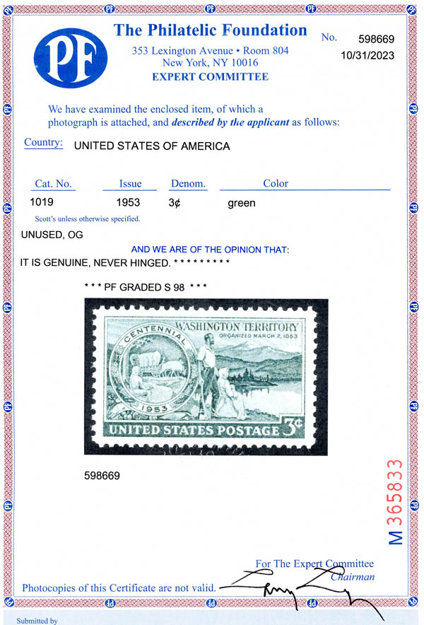 1953, 3¢ Washington Territory (Scott 1019), superbe. SMQ $60.