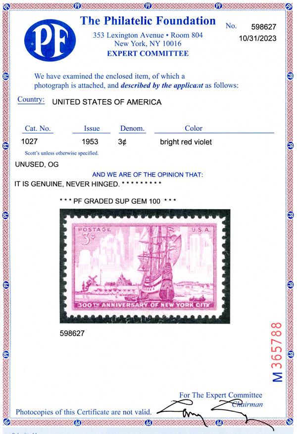 1953, 3¢ New York City (Scott 1027), superbe. SMQ $165.