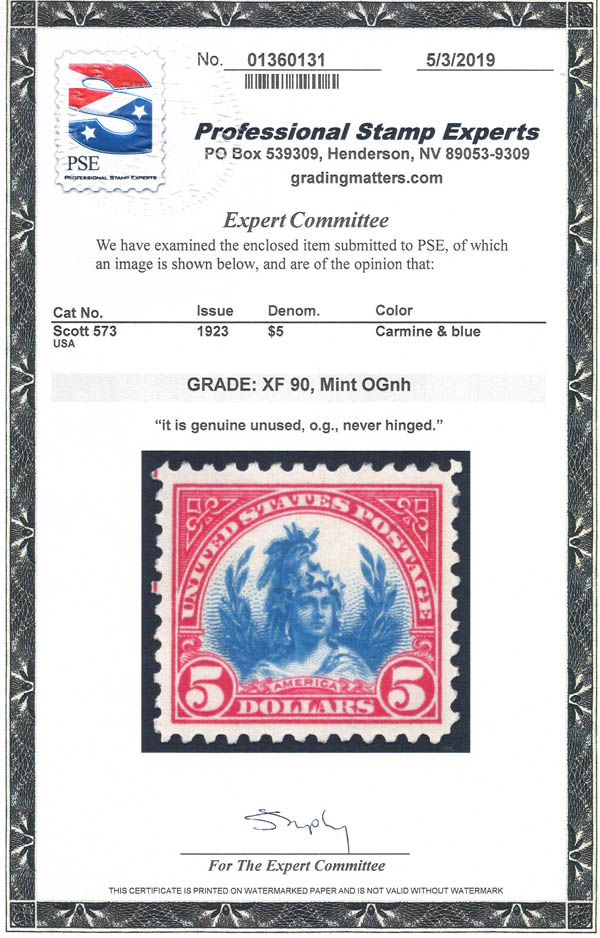 1923, $5 America (Scott 573), XF 90. Scott $180. SMQ $250.