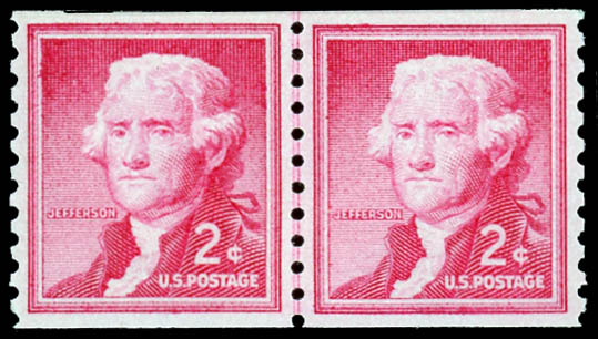 1968, 2¢ Jefferson, horizontal coil, large perf holes, dry printing (Scott 1055a), superbe. SMQ $200.