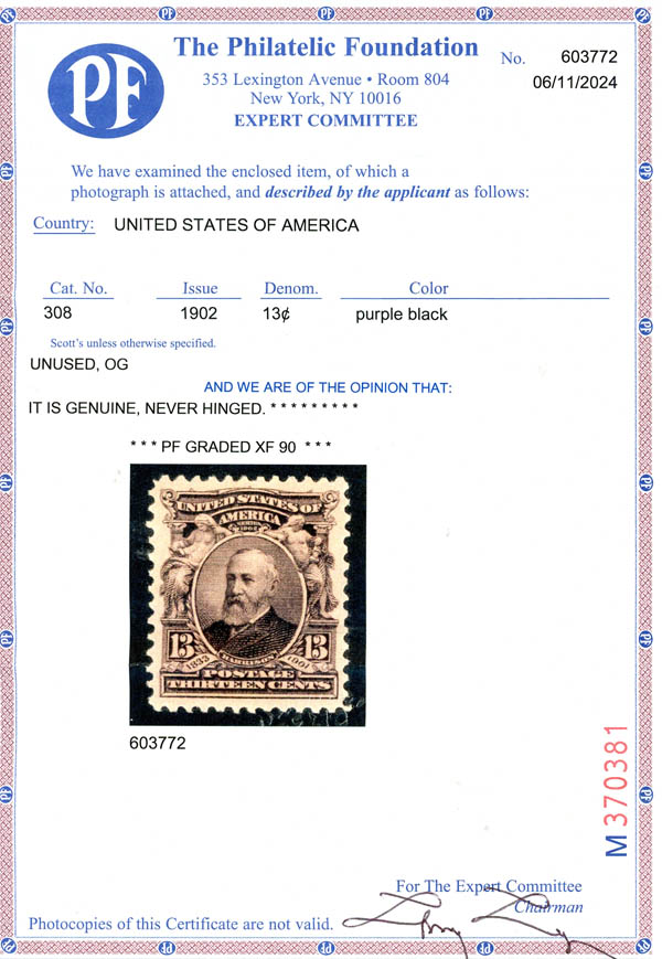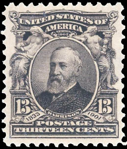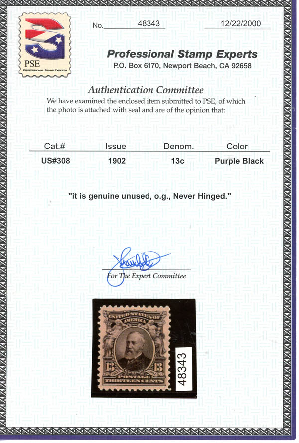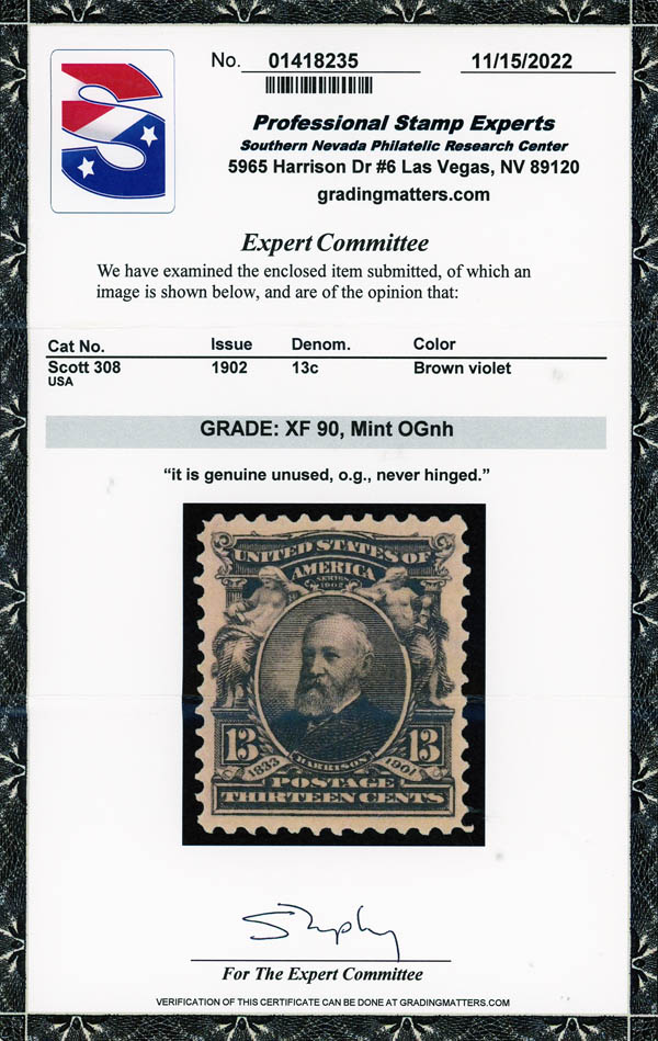 1902, 13¢ Harrison, purple black (Scott 308), XF 90. Scott $100. SMQ $275.