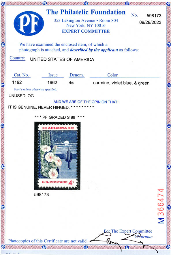 1962, 4¢ Arizona Statehood (Scott 1192), superbe. SMQ $60.