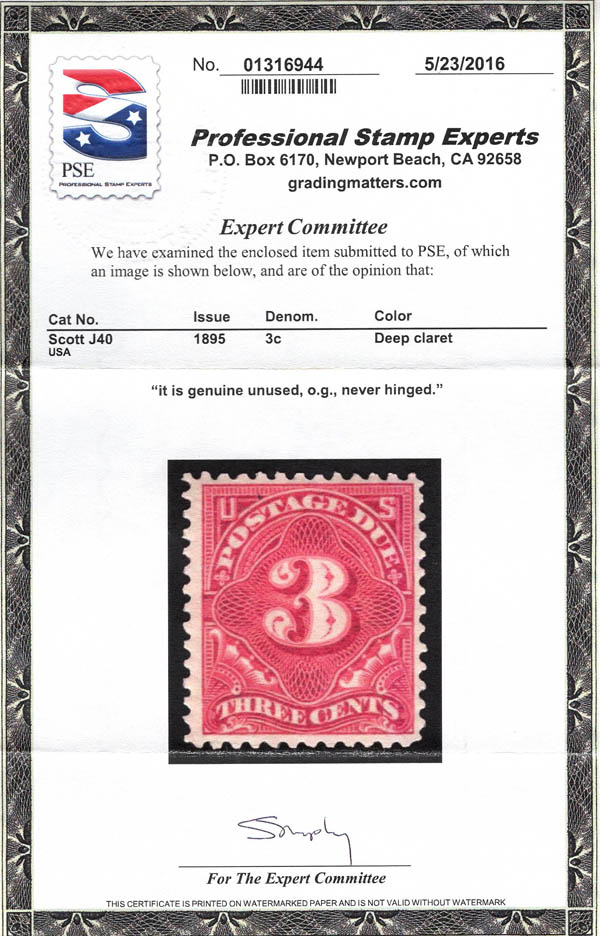 Postage Due, 1895, 3¢ deep claret, D.L. watermark (Scott J40), beau à très beau. Scott $225.