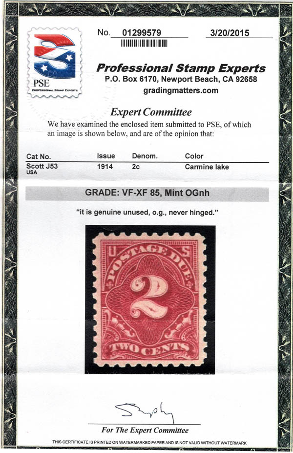 Postage Due, 1914, 2¢ carmine lake, S.L. watermark, perf. 10 (Scott J53), VF-XF 85. Scott $170. SMQ $200.