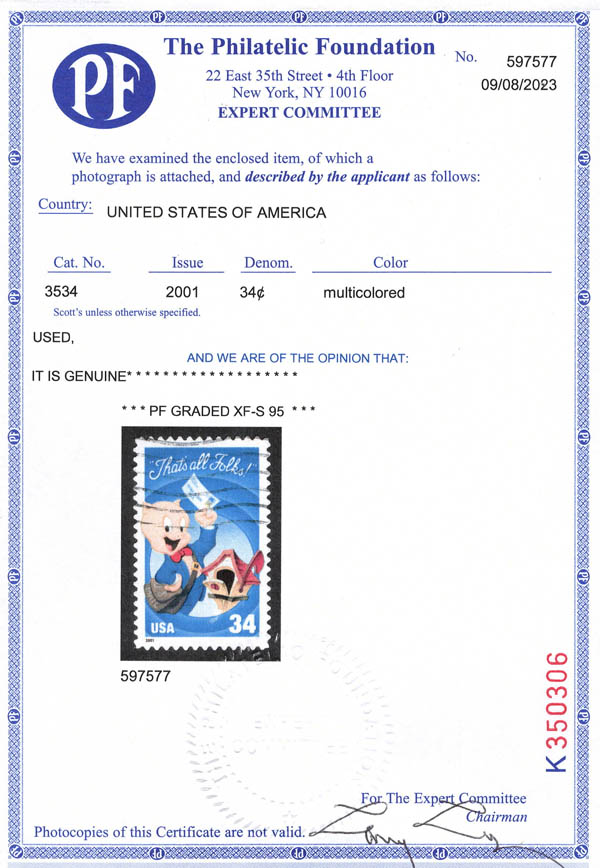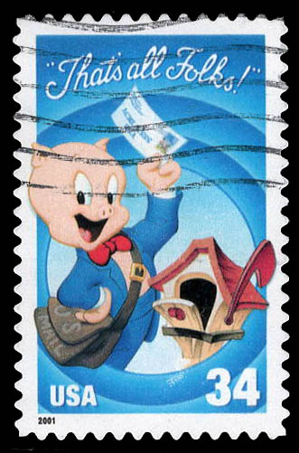 2001, 34¢ "That's All Folks!", self-adhesive, single (Scott 3534), superbe.