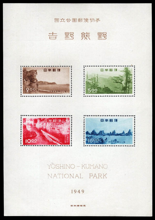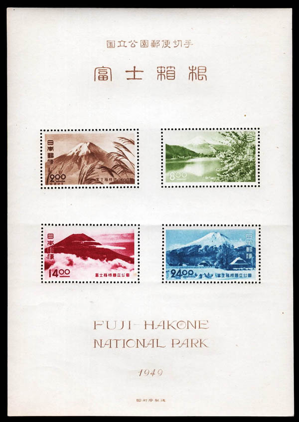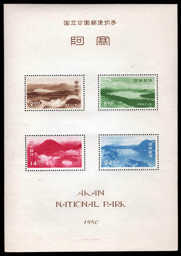 Japan, 1949-50, Yoshino-Kumano, Fuji-Hakone and Akan National Parks souvenir sheets (Scott 453a, 463a, 504a), all with folders, très beau. Scott $153. J.S.C.A. P44, P49, P54.