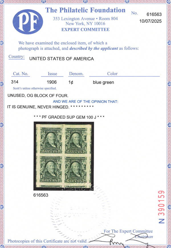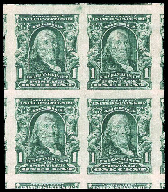 1906, 1¢ Franklin, blue green, imperf. (Scott 314), GEM 100 J. Not priced by SMQ or SSV as a block of 4. For a single GEM 100: SSV is $400, SMQ is $450. Scott $33.